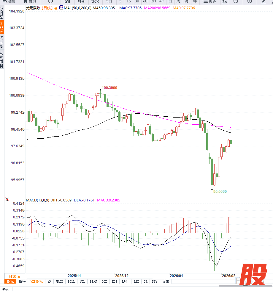 从日线结构来看,美元指数在连续反弹后进入高位整理阶段,整体仍维持在短期上升通道内运行。当前价格围绕97.90附近震荡,上方98.30—98.50区域构成阶段性重要阻力,该位置对应前期高点密集区,若无法有效突破,美元指数短期上行动能可能受限。下方来看,97.40构成第一支撑位,若出现更明显回调,97.00整数关口将成为关键防守区域,一旦失守,不排除指数回测96.50附近的可能。整体而言,在基本面利多与利空因素交织的背景下,美元指数短期更倾向于在97.00—98.50区间内高位震荡运行。