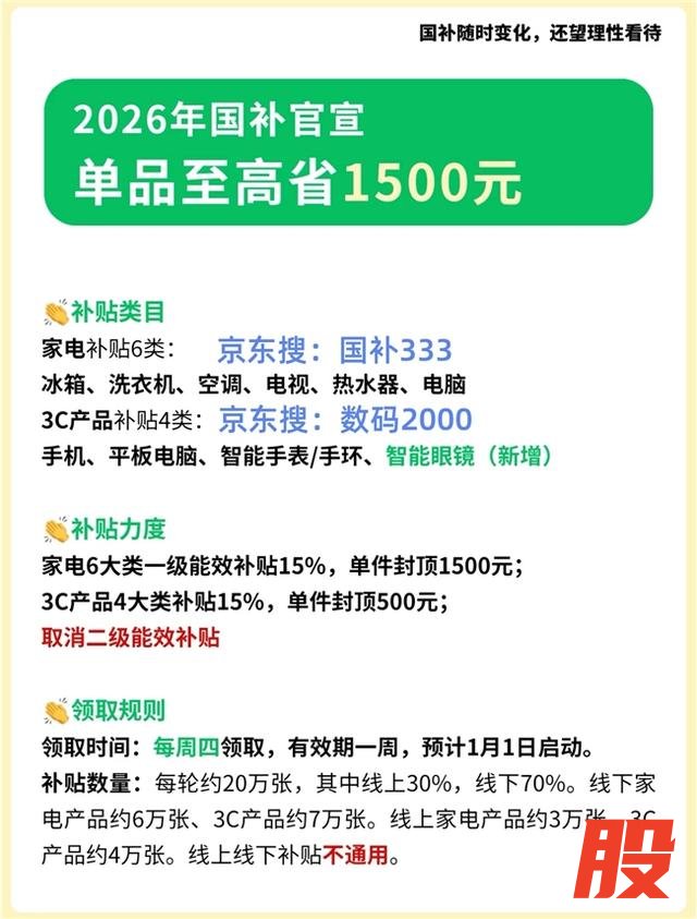 2026年全年国补计划投放3000-5000亿元,首批625亿元已于元旦前下达至各地方,春节消费旺季期间额度分阶段释放,先到先得,建议尽早申领。