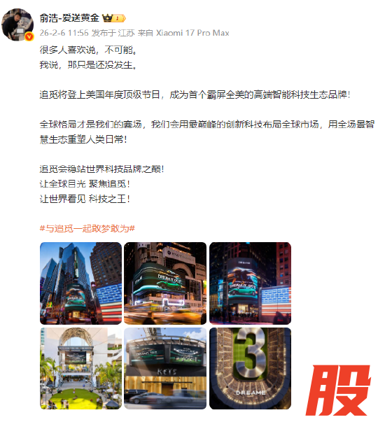 2月6日,追觅科技创始人兼CEO俞浩微博发文表示,追觅将登上美国年度顶级节目,成为首个霸屏全美的高端智能科技生态品牌。
